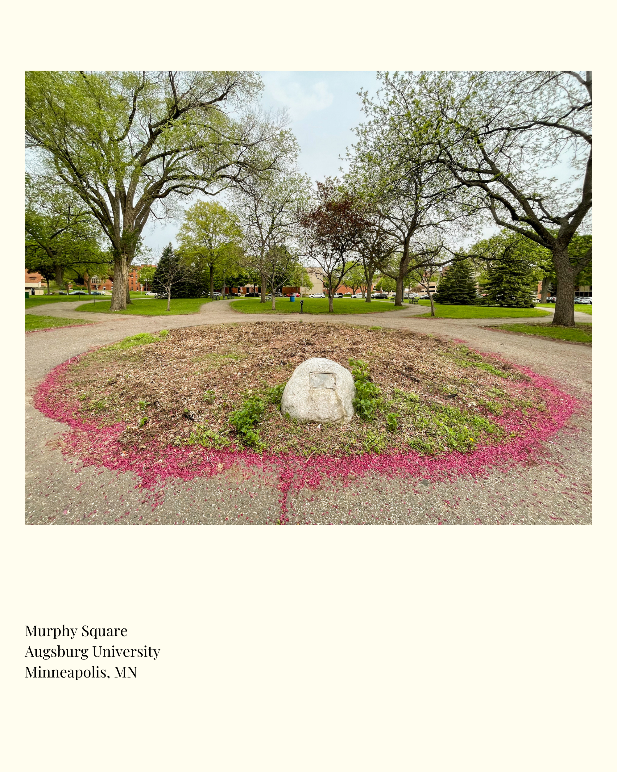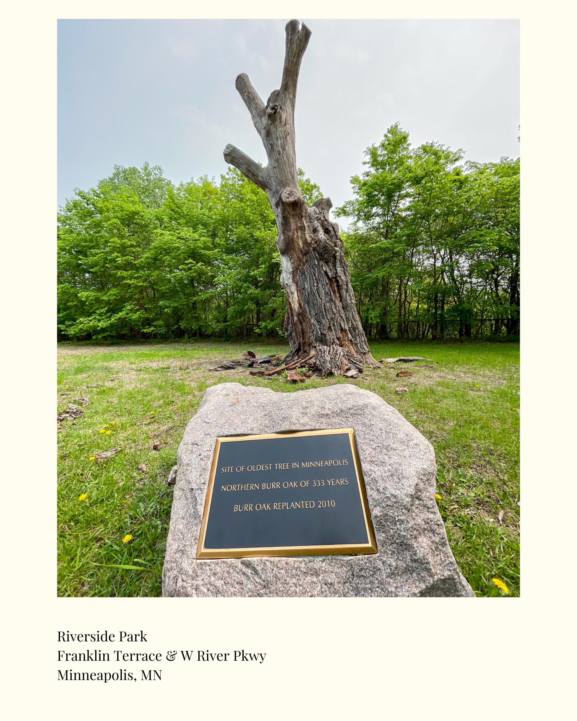 Crossing the Franklin Bridge and returning to the West Bank, I was en route to Murphy Square when I stumbled upon the 'Site of the Oldest Tree in Minneapolis.' This startling juxtaposition incited a feeling of being drawn to the location by the surrounding trees, almost as if to pay a visit to this sacred memorial.