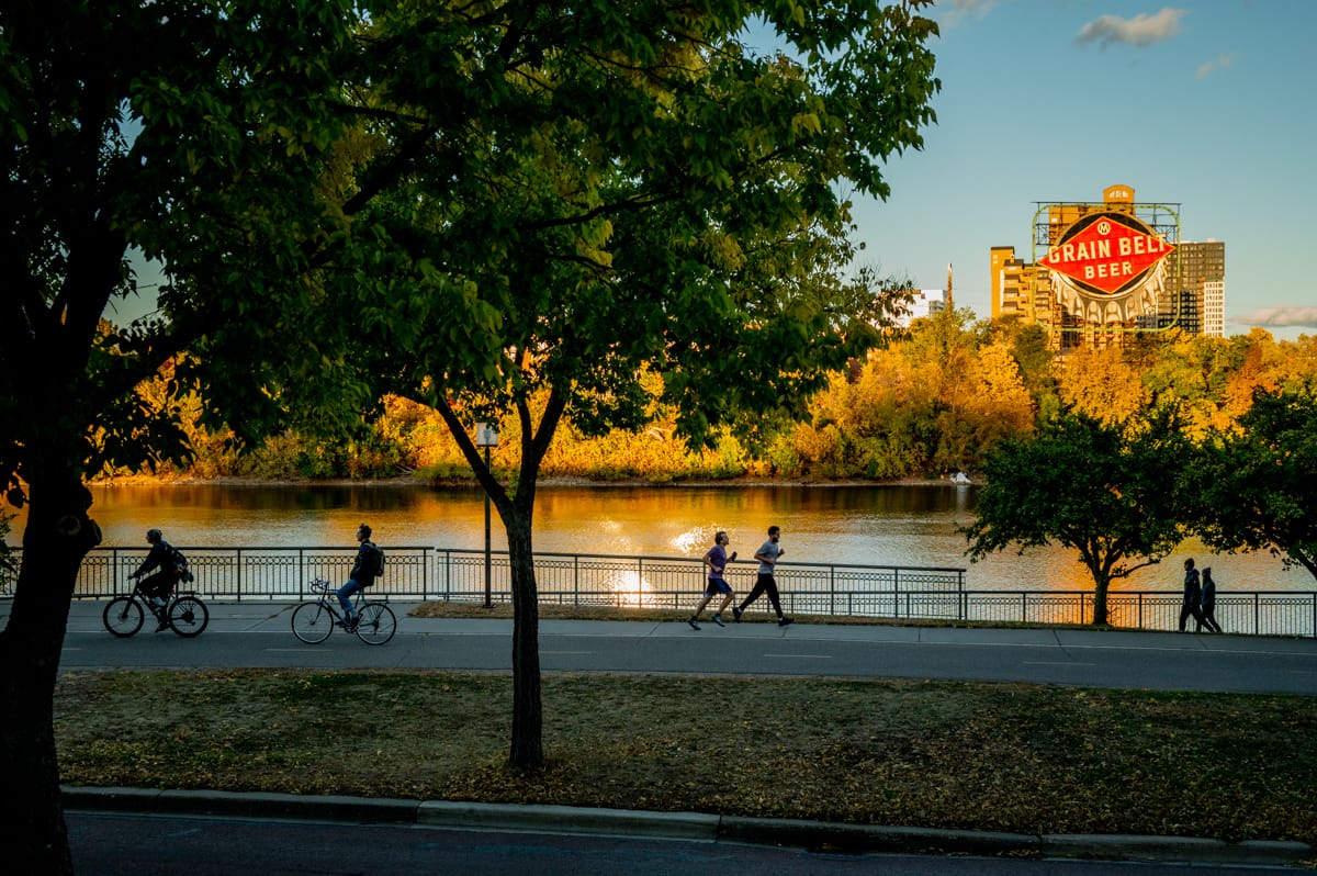 While walking, I began to reflect on how Minneapolis’ excellent bike infrastructure enhances the pedestrian experience. The network of dedicated bike lanes, greenways, parks and paths — and the integration with the broader transit system — both supports cycling and fosters a symbiotic relationship with pedestrian infrastructure. As I walked the city making landscape photographs, I was also inspired by how cyclists navigated the network. I’m drawn to the movement, energy and style of cycling. It brings a burst of energy and dynamism to public spaces that make them much more enjoyable. The strong sense of community, most visible in group bike rides, was contagious. As a pedestrian, I find no better allies and sources of inspiration than the cycling community.